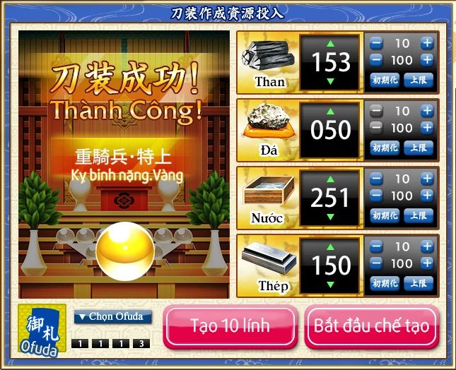 Khi dùng ofuda tạo 10 lính, sẽ không gặp phải thất bại và đảm bảo tạo ra ít nhất một số lượng lính vàng, tùy theo loại ofuda sử dụng: