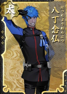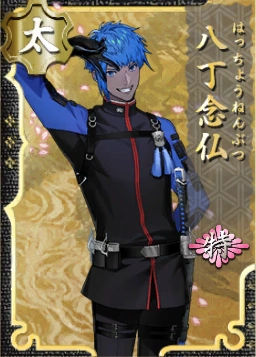 | Thư viện kiếm | 俺は八丁念仏。古備前助村作の太刀だって言われてる。 元をたどれば戦国最強の鉄砲傭兵集団『雑賀衆』の棟梁、鈴木孫市が持ってたってことらしいんだけど……。 あ~、細かいことはいちいち覚えていない方がいいってこともあるみたいだしっ? | |