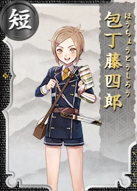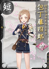 | Thư viện kiếm | 俺は包丁藤四郎! 藤四郎の兄弟で、 包丁みたいな形をしてるんだ! 俺の主は、 徳川家康公だったんだぞ! どうだ、 すごいだろー! | |