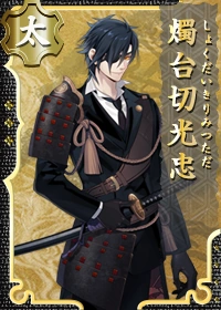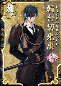 | Tôi là Shokudaikiri Mitsutada. Một thanh katana từng được sử dụng bởi lãnh chúa Date Masamune. Tôi không có ác cảm gì đối với ngài Masamune, nhưng tên của tôi đến từ sự việc khi tôi chém một người đã đồng thời cắt đứt cái chân nến gần đó…… Mặc dù đó thật sự là một giá nến bằng đồng, nhưng sẽ thật ngầu hơn nếu được cắt cái gì cứng hơn một chút. | ||