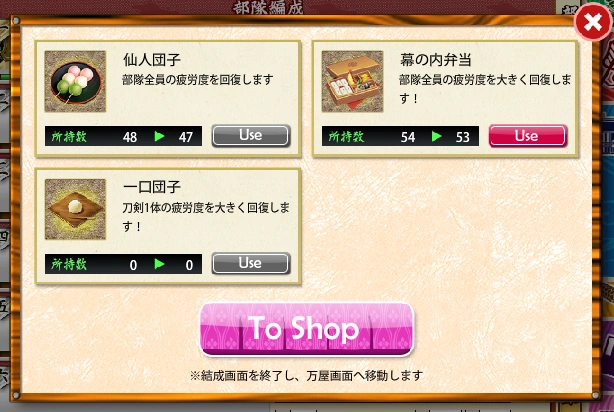 Another way to recover fatigue is to use Sennin Dango, Makunouchi Bento, or One Bite Dango. Using these items will instantly recover your swords' fatigue. The items can be purchased from the Shop. All three items are one-time use item, so use them wisely.
