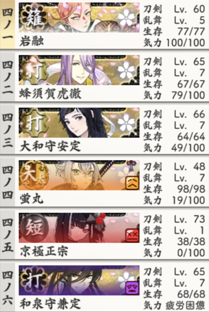 | Sortie/Expedition/Practice 10 times with severely fatigued sword | Exhausted | Extreme decrease in fighting ability (-70%), fatigue accumulation of other swords will increase, fighting ability of already fatigued or severely fatigued swords will decrease further, expeditions will not return with Great Success, cannot be sent to repairs |