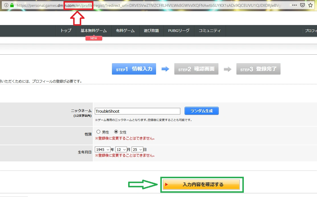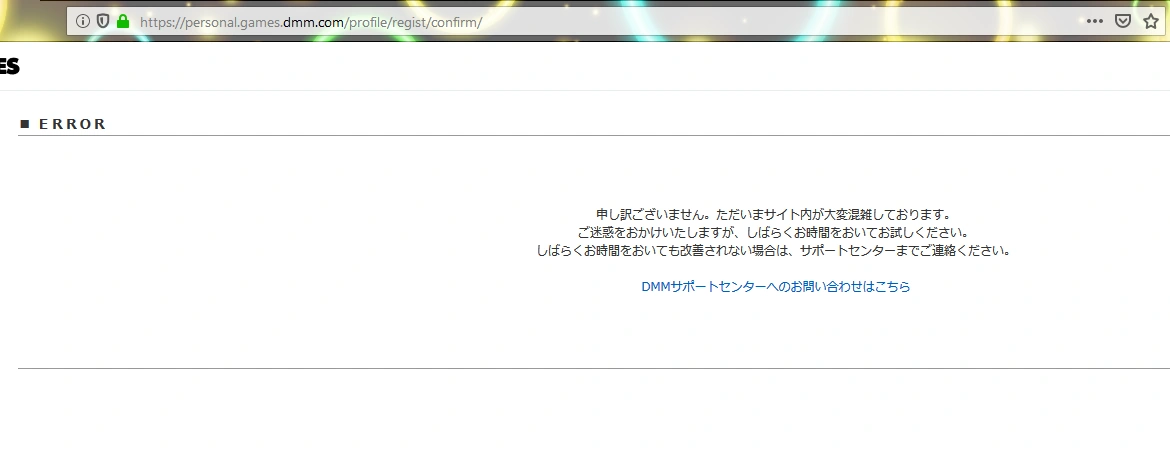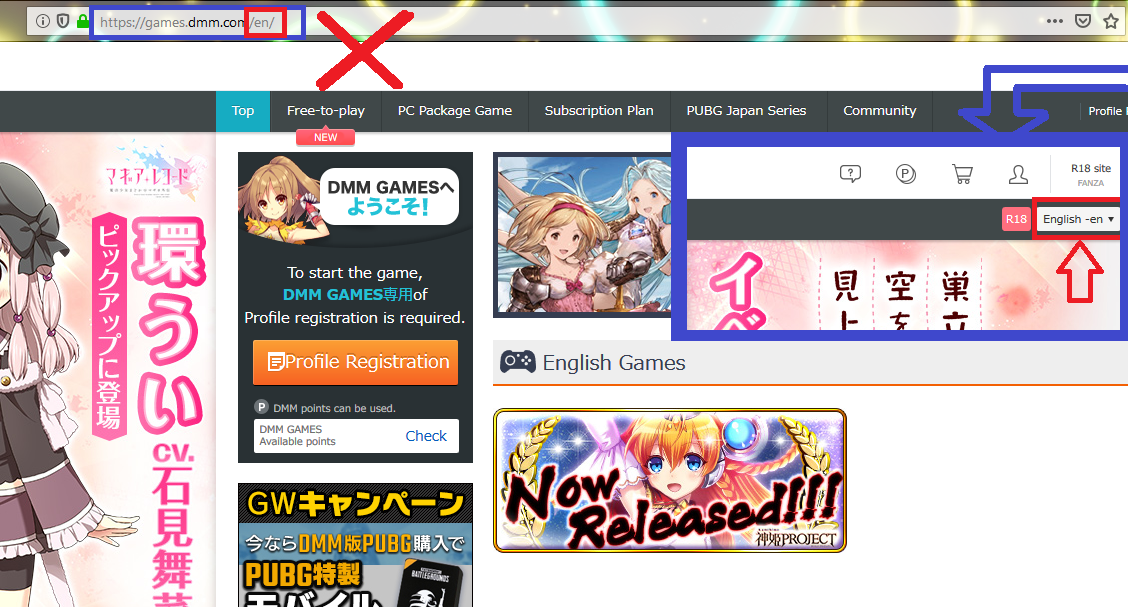 If after making your DMM account and trying to launch the game, you encounter this error message (pictured bottom-right), you have seen the DMM English locale 'Bug'. It seems that if new game profiles are requested from an English DMM Games page, the server cannot process them. Follow the steps below to workaround that issue.