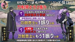 A portal to Tenpou Edo has momentarily opened where history’s been altered! With the arrival of a mysterious transmission, the citadel is called to sortie one squad, consisting of five members to the year 1843! You are to cooperate with the inspector on-site and work towards completing the given mission. Players are encouraged to deploy Hachisuka Kotetsu, as he is featured in the event. The event also features 15 pages worth of event-specific recollections, all of them surrounding Hachisuka Kotetsu and the two new swords Suishinshi Masahide and Minamoto Kiyomaro, both of whom can be obtained from this event.